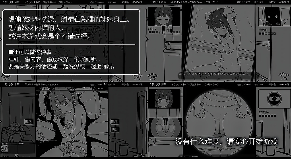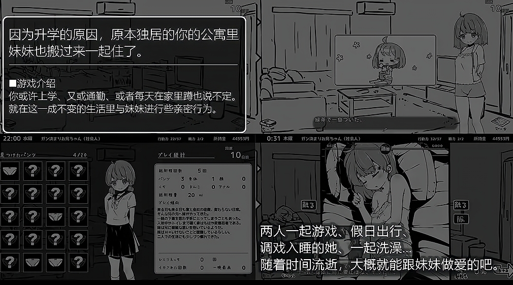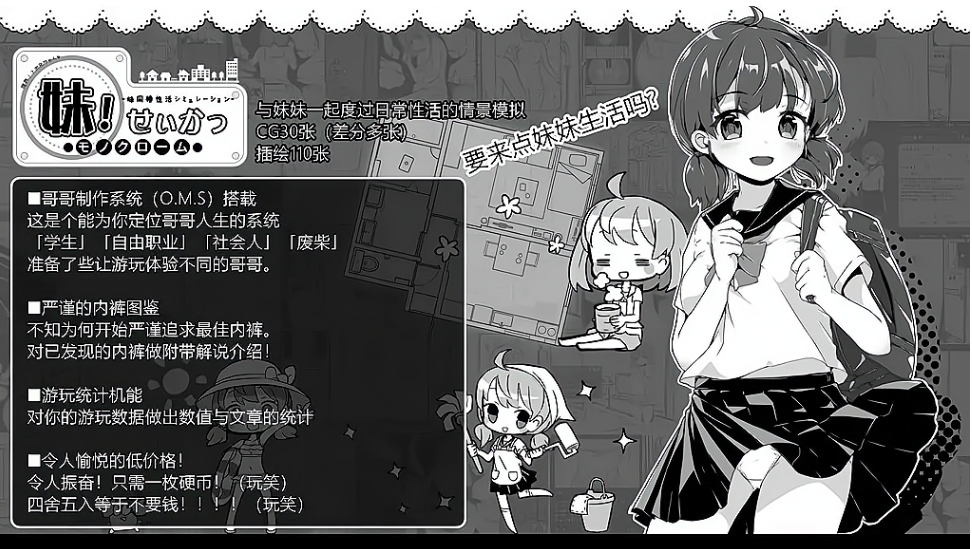 这是由【いぬすく】社团发布的一款无敌爆款SLG互动游戏!玩法和家出少女类似,不过回的妹妹不是捡来的,而是真正的妹妹!游戏虽然是以黑白单色CG+日常抽象背景搭建~日常活动的Q版CG简直萌化了宅男之心,怪不得那么多人买!该社保CG场景一点都不抽象,为了大家福利,H方面画得极其精细而社保!而且黑白的好处在于作者可以把上色的功夫花到了更精细的游戏细节上~让这款游戏的内容和玩法更加丰富和又代入感!